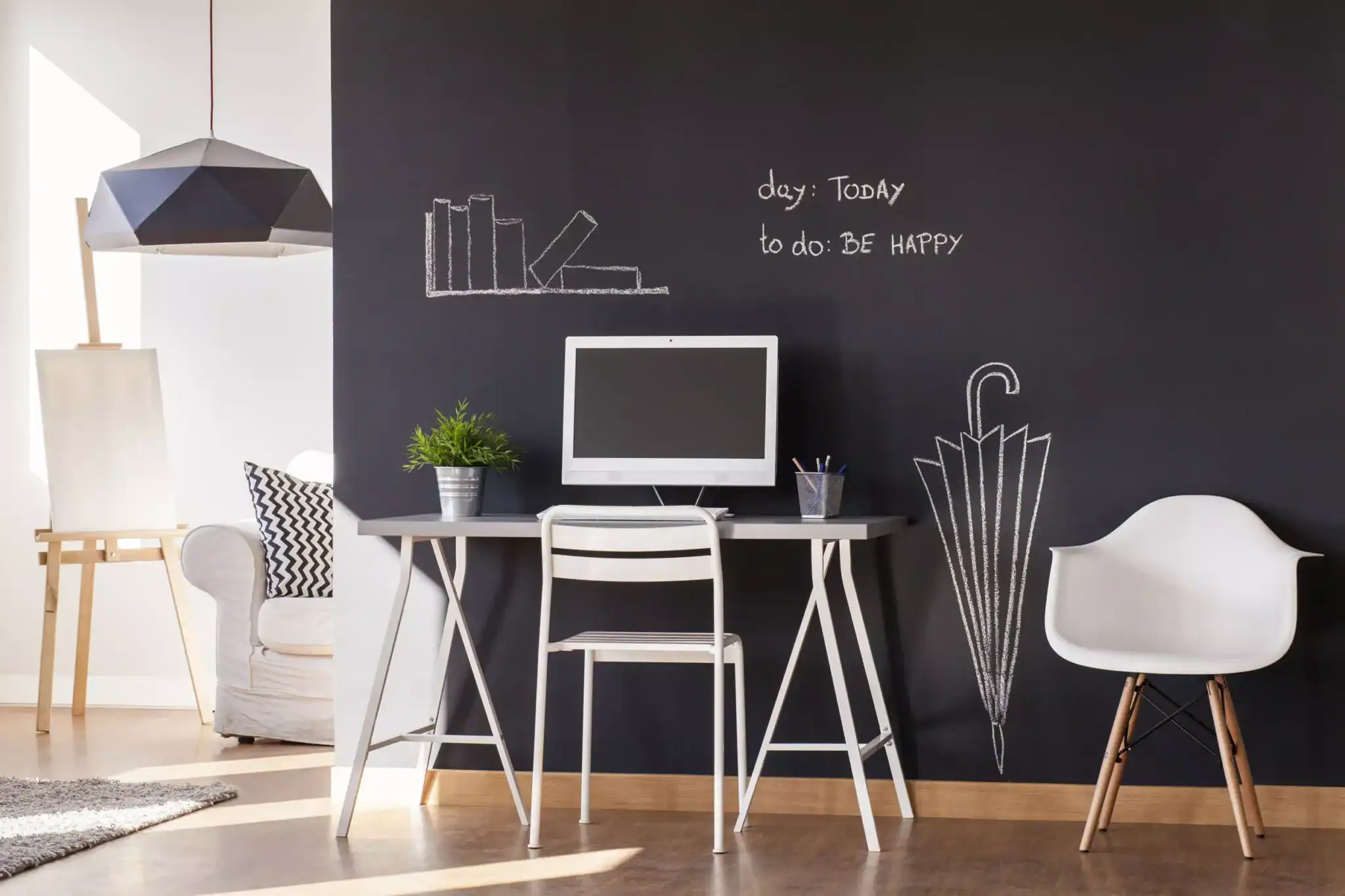 Finalement, si vous ne souhaitez pas intégrer de tableaux ou d’éléments « physiques » directement sur vos murs, vous pouvez opter pour des peintures magiques ! Plus sérieusement, ces peintures ont la faculté de transformer vos murs en véritables feuille géante. Si vous souhaitez utiliser des craies, optez pour une peintures ardoise ! Celle transformera votre mur en véritable tableau. À l’inverse, si vous préférez les feutres, choisissez une peinture tableau blanc. Finalement, si aucun des deux ne vous convient, il existe des peintures magnétiques ! Ce matériau, là aussi couvrant, vous permet d’aimanter tout ce dont vous souhaitez. Une solution très pratique aussi bien pour décorer que pour travailler.