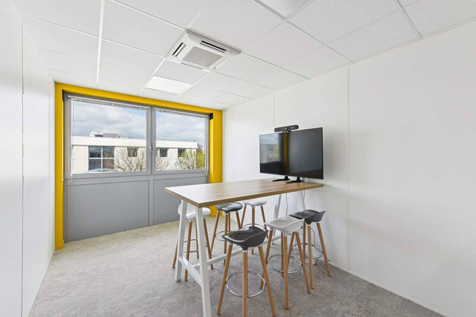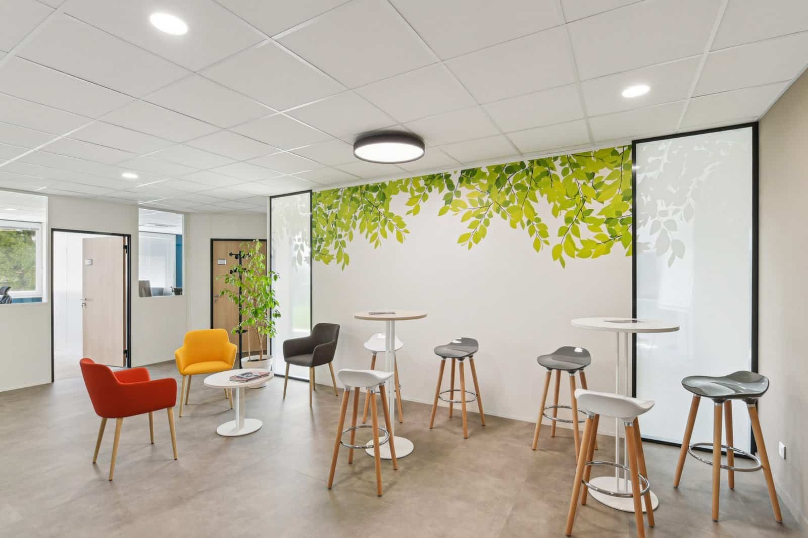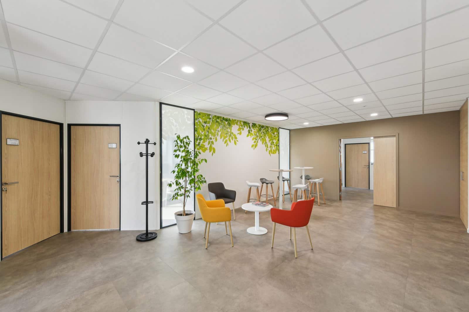 L’organisation spatiale a été pensée pour favoriser les échanges tout en respectant les besoins de chaque service : les espaces communs et collaboratifs au rez-de-chaussée, les fonctions supports et de direction à l’étage. Le design, volontairement sobre et naturel, capitalise sur la lumière traversante du bâtiment et les teintes claires, ponctuées par des touches colorées en lien avec la charte graphique du groupe.