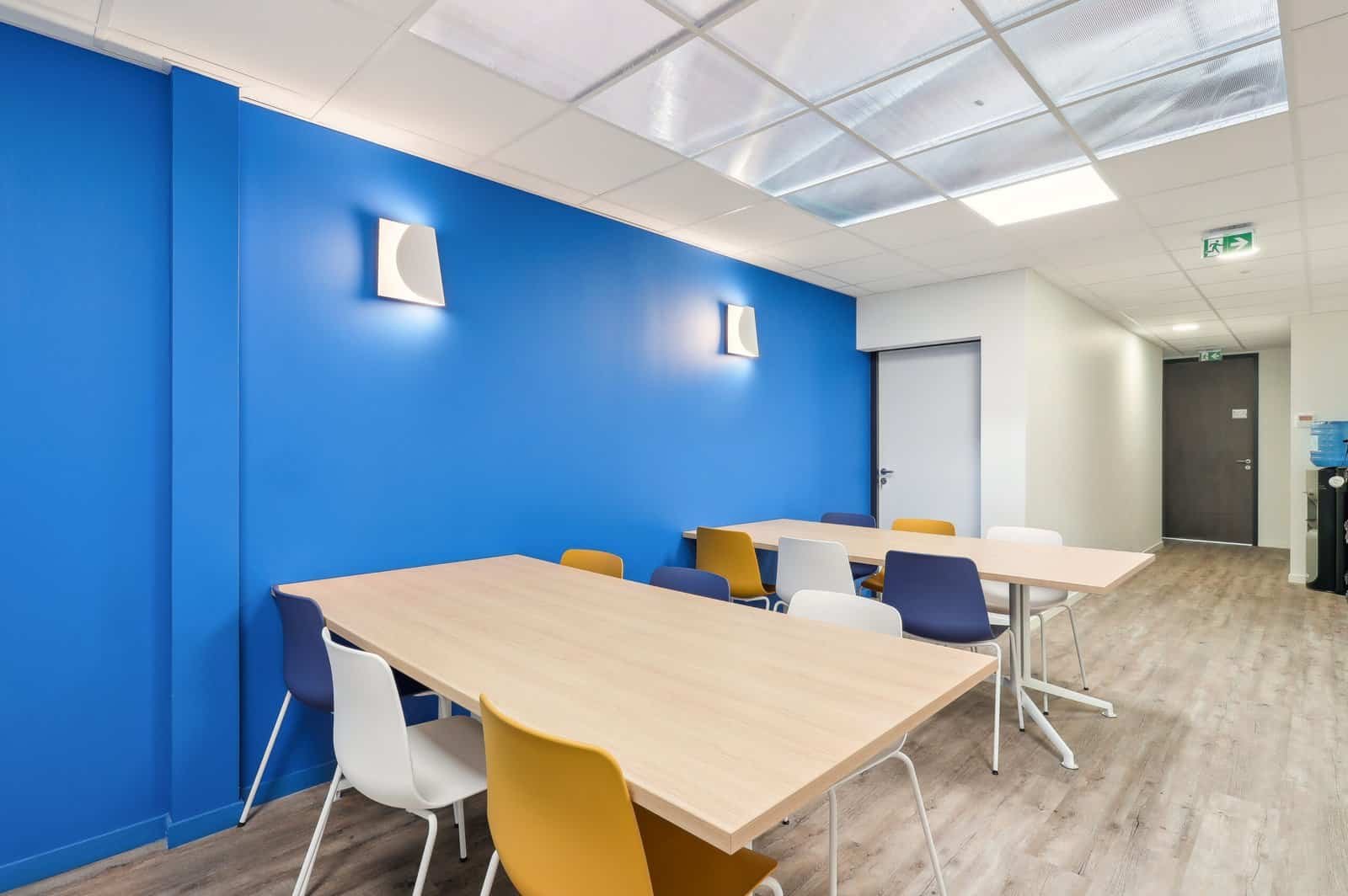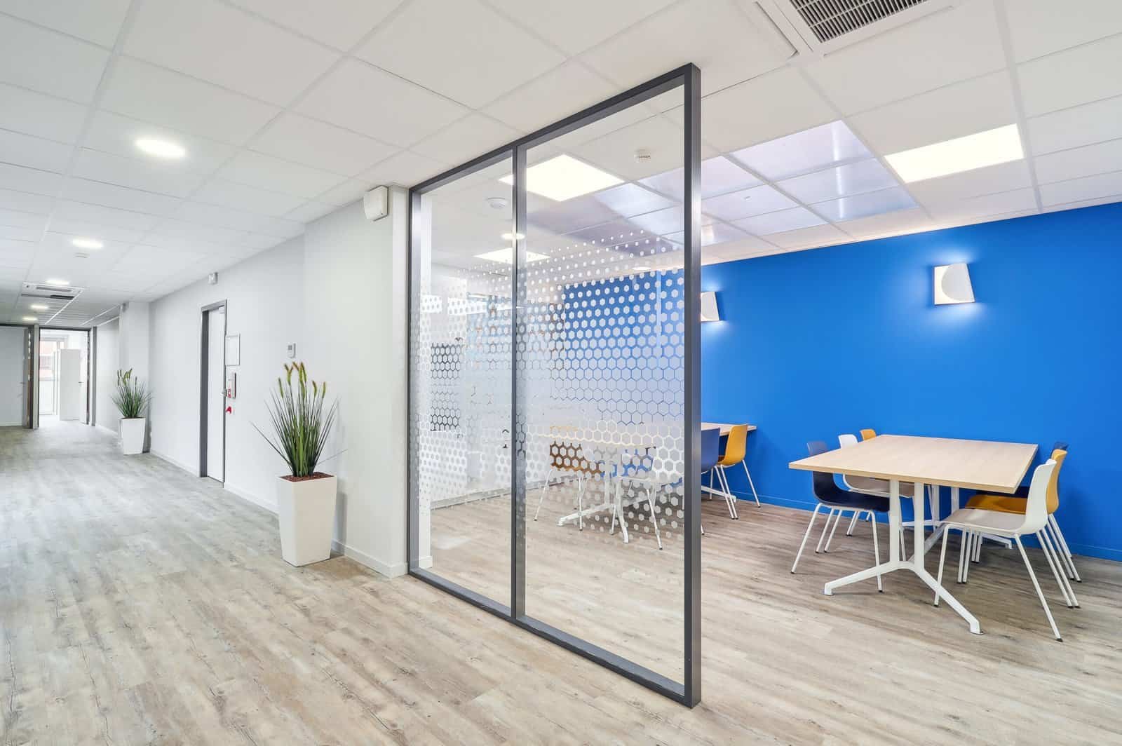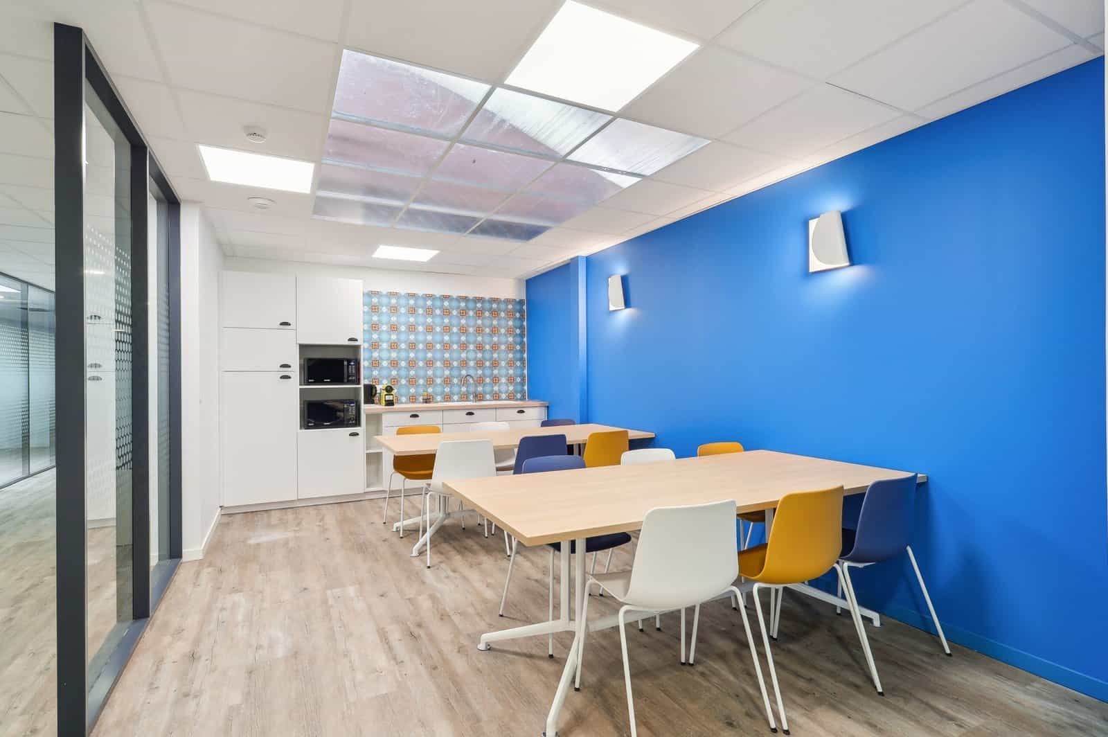 Chaque choix décoratif et technique (sols harmonisés, touches de bleu dynamiques) a été guidé par les valeurs de la marque. En plus de l’aménagement du plateau de bureau, une rénovation importante a été menée sur la partie travaux. En effet, une division de lot a été opérée, puis le curage complet de l’espace, le changement du système de chauffage, la reprise d’éléments maçonnés ou encore la suppression d’une cage d’escalier ont été réalisés pour offrir aux employés des espaces parfaitement adaptés à leurs besoins.
